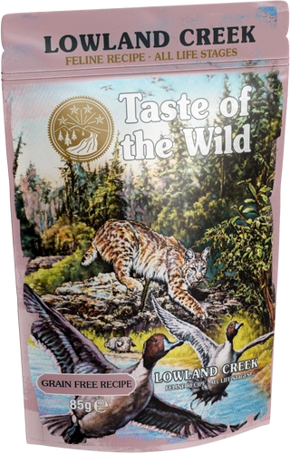 TASTE OF THE WILD Lowland Creek 85 g. Kawałki indyka, kurczaka, wątróbki kurczaka i kaczki w sosie. Karma dla kotów w każdym wieku.